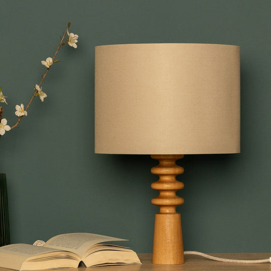 Elegante Holz-Tischlampe mit geriffeltem Standfuß und Stoffschirm - Minimalistische Tischleuchte aus Naturholz für Wohnzimmer & Schlafzimmer, skandinavisches Design