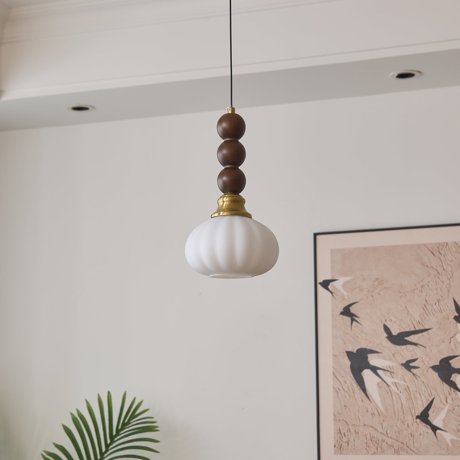 Diese elegante Pendelleuchte kombiniert nostalgische Formen mit natürlichen Materialien und sorgt für eine warme, einladende Atmosphäre. Der sanft geschwungene Glasschirm in Blütenform und die stilvollen Holzelemente machen diese Lampe zum Hingucker in Esszimmer, Küche oder als gemütliches Lichtobjekt im Wohnzimmer.