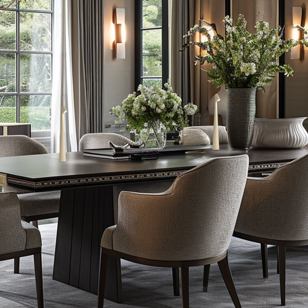 Diese ultramoderne LED Tischlampe vereint minimalistisches Design mit smarter Funktionalität. Mit ihrem schlanken, konisch zulaufenden Körper und dem dezent geneigten Leuchtkopf sorgt sie für gerichtetes Licht – perfekt für gemütliche Abende auf dem Sofa, als Leselicht oder als elegante Akzentleuchte in Bars und Restaurants.